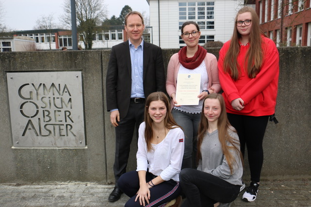 Im Zuge der Verleihung des Alstertaler Bürgerpreises 2017 erhielten drei Schülerinnen, Janna Hille, Caitlin Hillert und Joséphine Ravn, stellvertretend für das Gymnasium Oberalster ein Urkunde des Regionalausschusses Alstertal. Die Urkunde wurde verliehen als Dank und Anerkennung für die langjährige Pflege und Erhaltung des Gedenkortes des ehemaligen Außenlagers Sasel des KZ Neuengamme.