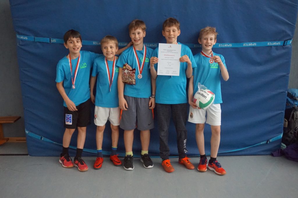 Am 12. April 2019 fand die Zwischen- und Endrunde des Volleyball Mixed Turniers der fünften bis siebten Klassen statt. Es haben sich acht Mannschaften qualifiziert, aber es sind nur sieben angetreten. Wir, die Mannschaft GOA 3, haben uns als einzige Mannschaft vom Gymnasium Oberalster qualifiziert. In der Zwischenrunde haben wir zweimal gewonnen und einmal unentschieden gespielt. So sind wir Erster in unserer Gruppe geworden. Dann, im Finale der Endrunde, spielten wir gegen die erste Mannschaft des Heinrich Heine Gymnasiums. Den ersten Satz haben wir klar verloren. Den zweiten Satz haben wir aber deutlich knapper verloren. Das war ziemlich schade, weil wir nur 25:21 verloren haben. Dadurch wurde wir Zweiter und damit Vizemeister.